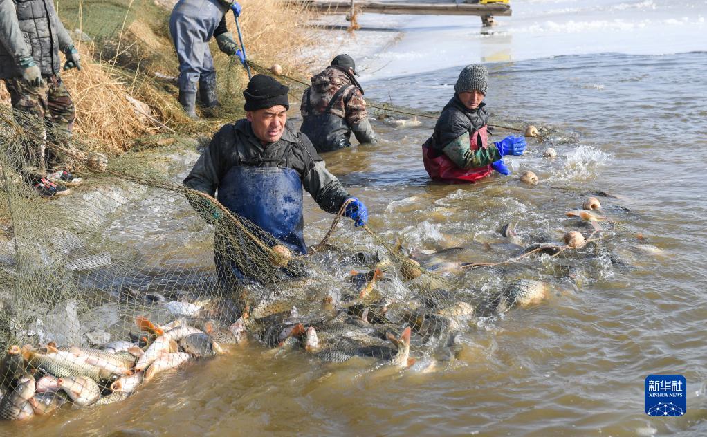 1月5日,達拉特旗樹(shù)林召鎮的村民在魚(yú)塘中捕魚(yú)。
