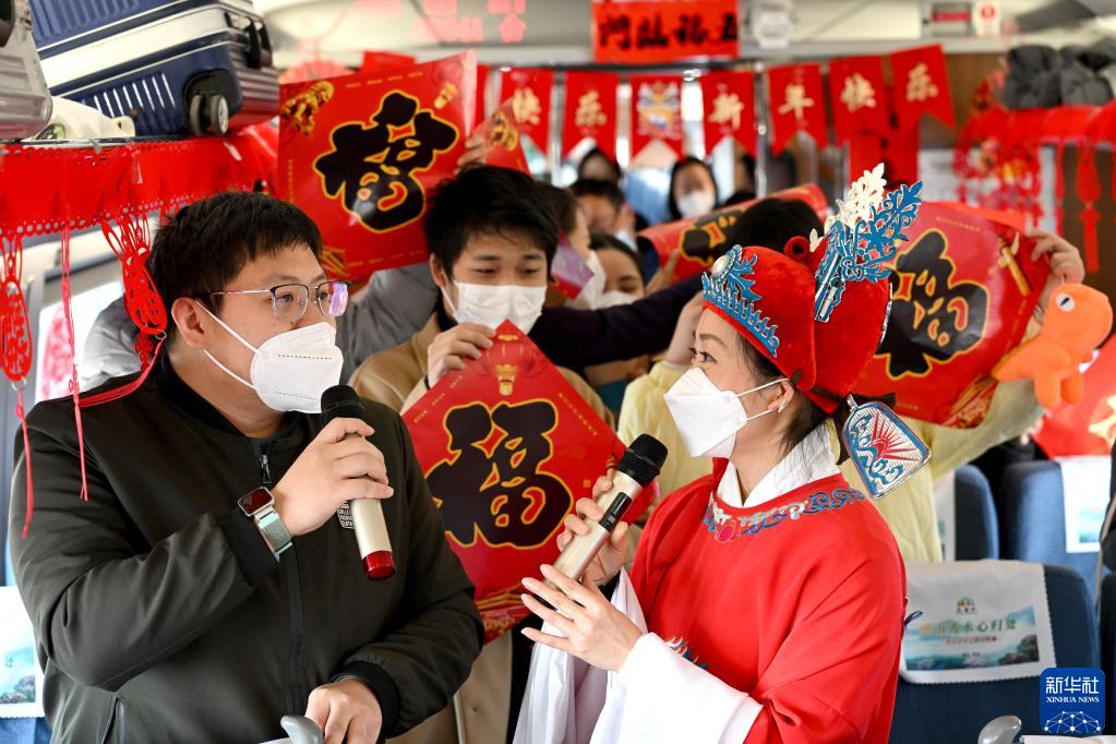 當日,中國鐵路上海局集團有限公司合肥客運段組織工作人員,將G8341次列車(chē)裝扮一新,在列車(chē)上舉辦“情暖回家路”主題活動(dòng)。猜謎語(yǔ)、演唱黃梅戲、手寫(xiě)福字送祝福,讓乘客在旅途中感受節日氛圍。