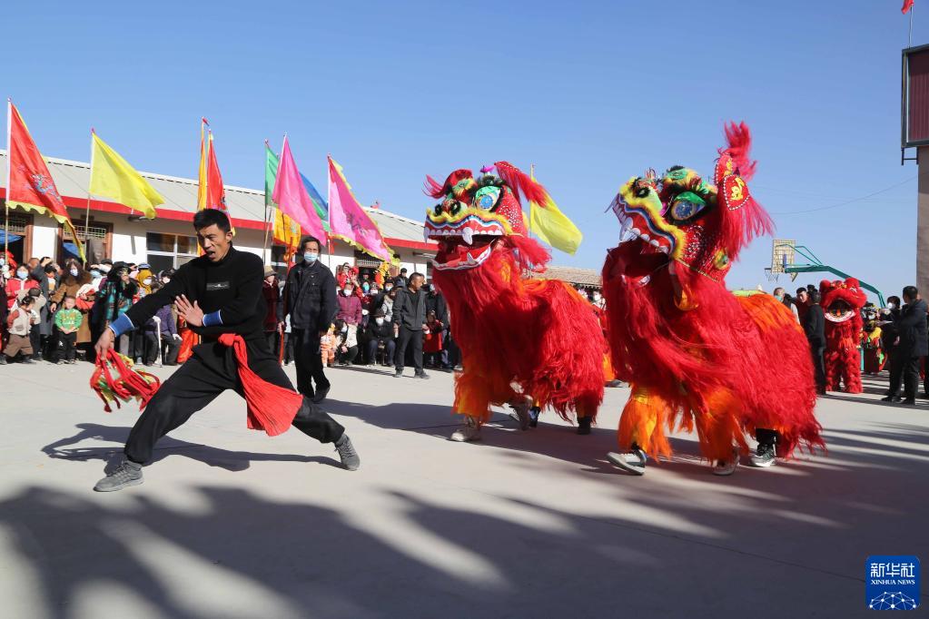 1月6日,甘肅省定西市安定區內官營(yíng)鎮萬(wàn)崖村社火隊演練傳統社火節目舞獅。