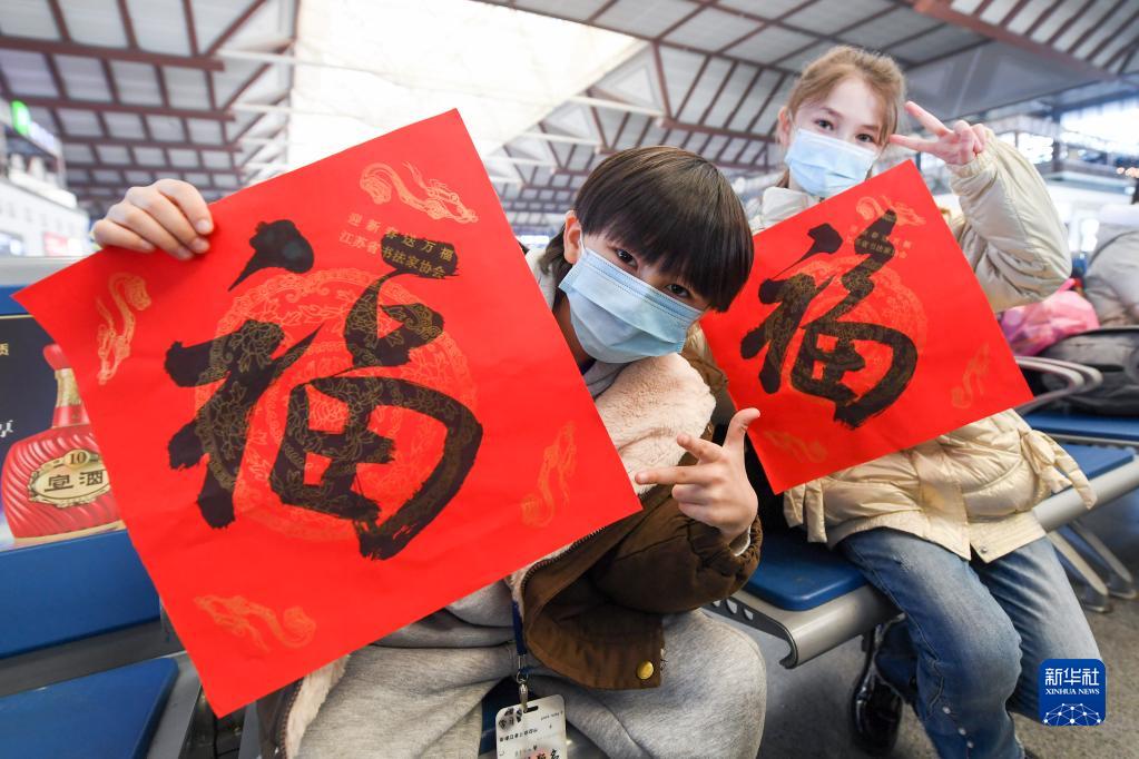 1月7日,旅客在蘇州站候車(chē)大廳展示“?!弊?。