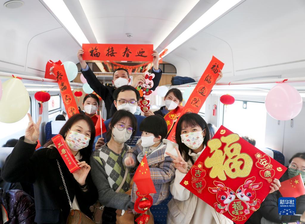 1月7日,旅客和乘務(wù)員在北京豐臺開(kāi)往福州的D759次列車(chē)車(chē)廂里合影。
