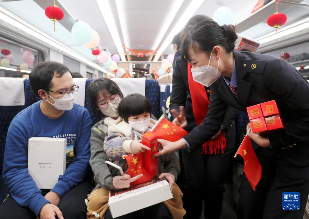 1月7日,乘務(wù)員在北京豐臺開(kāi)往福州的D759次列車(chē)車(chē)廂里為小朋友發(fā)放互動(dòng)游戲獎品。