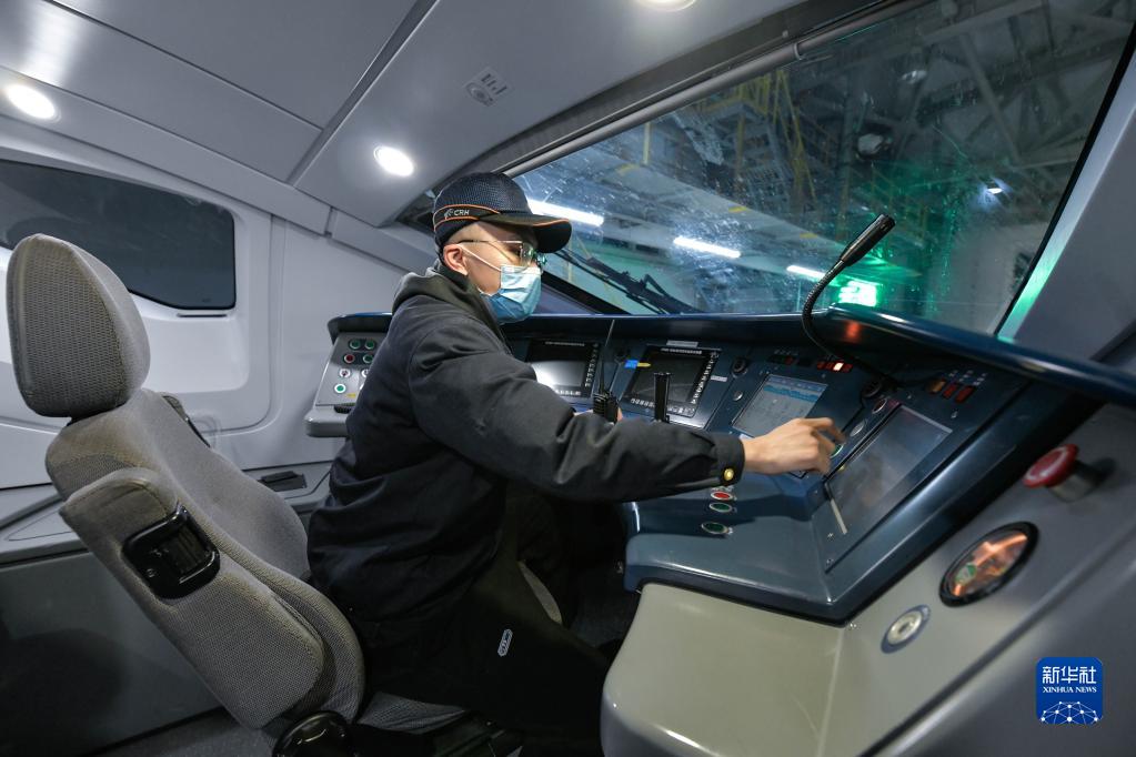 1月6日晚,動(dòng)車(chē)司機在貴陽(yáng)北動(dòng)車(chē)運用所對動(dòng)車(chē)組列車(chē)進(jìn)行功能測試。