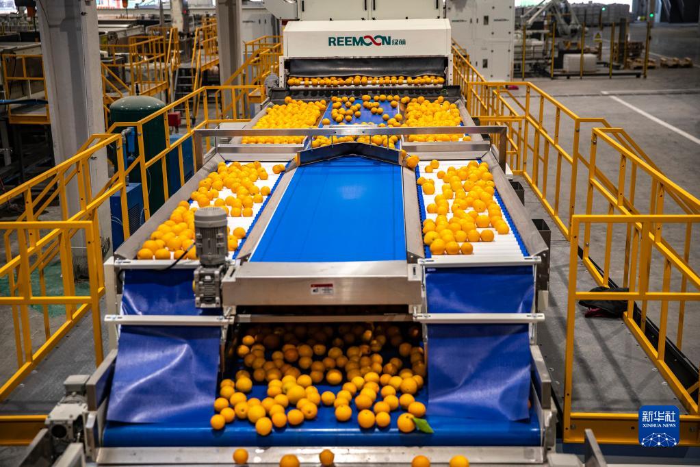 1月6日,在中國三峽柑橘(奉節臍橙)交易中心,剛采摘的臍橙通過(guò)全自動(dòng)分揀線(xiàn)進(jìn)行清洗和分級裝筐。