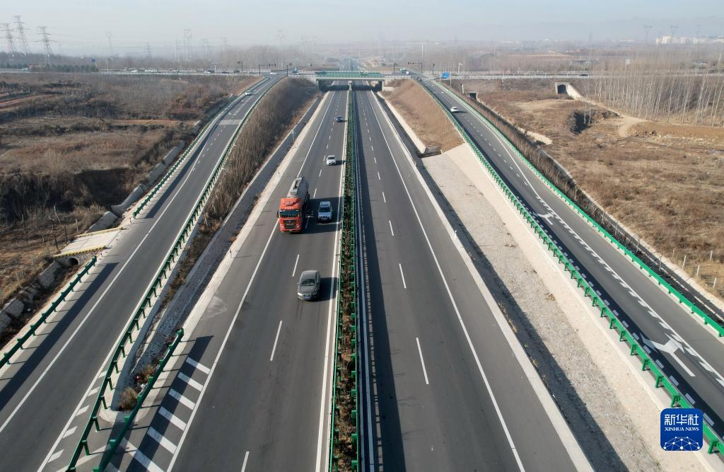 1月7日,車(chē)輛從秦皇島市海港區境內的國道102線(xiàn)與民族北路互通立交橋上通過(guò)(無(wú)人機照片)。