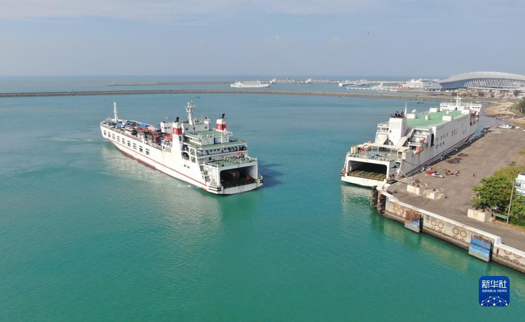 1月6日,在位于??诘幕浐hF路輪渡南港碼頭,粵海鐵1號輪渡正在??坎次唬o(wú)人機照片)。
