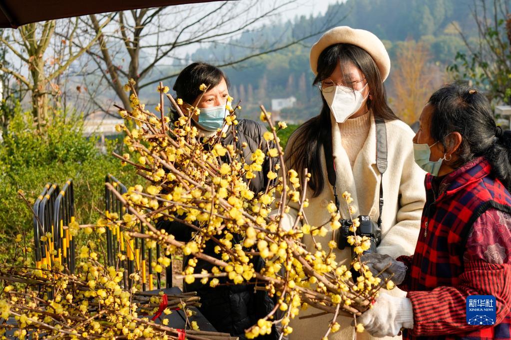 1月7日,在重慶市北碚區靜觀(guān)鎮,游客在選購臘梅花束。
