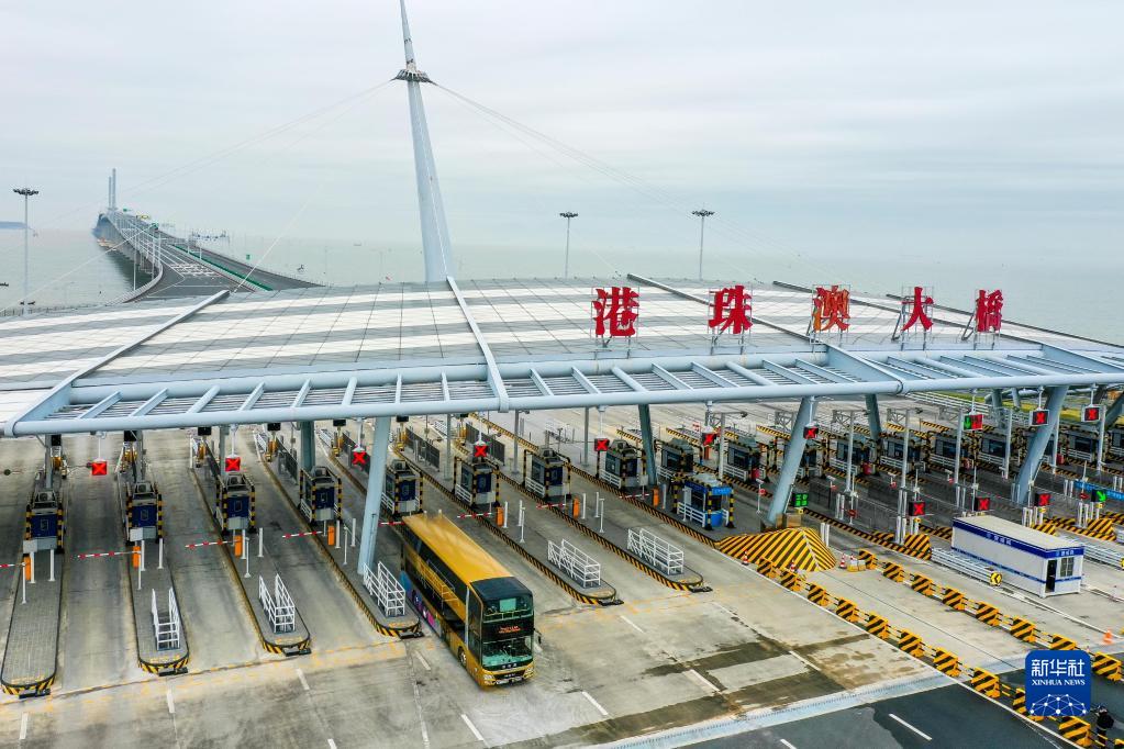 1月8日,一輛從香港開(kāi)往珠海的港珠澳大橋穿梭巴士入境珠海(無(wú)人機照片)。