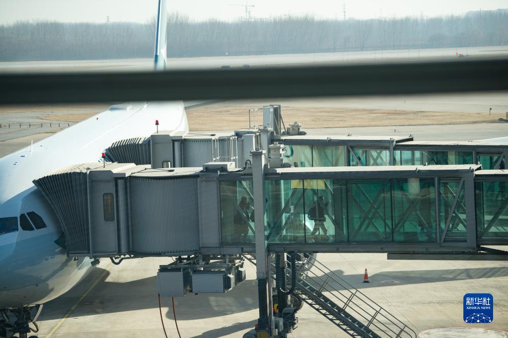 1月8日,旅客從CX334次航班(香港至北京)下機,這是當日首都國際機場(chǎng)的首架入境航班。