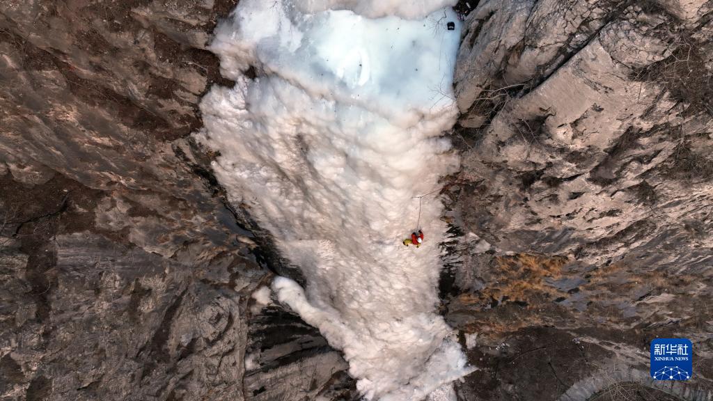 1月8日,在云夢(mèng)山景區,攀冰愛(ài)好者在冰壁上攀爬(無(wú)人機照片)。