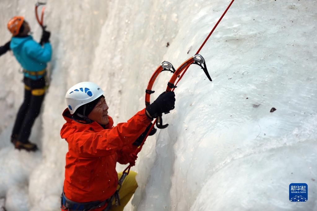 1月8日,在云夢(mèng)山景區,攀冰愛(ài)好者在冰壁上攀爬。