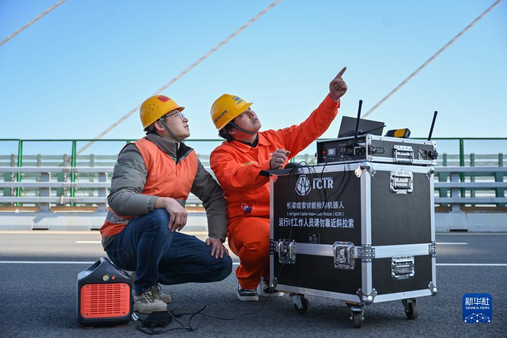 1月8日,在福建平潭公鐵兩用跨海大橋,福州工務(wù)段工作人員在分析橋梁纜索智能檢測機器人作業(yè)數據。
