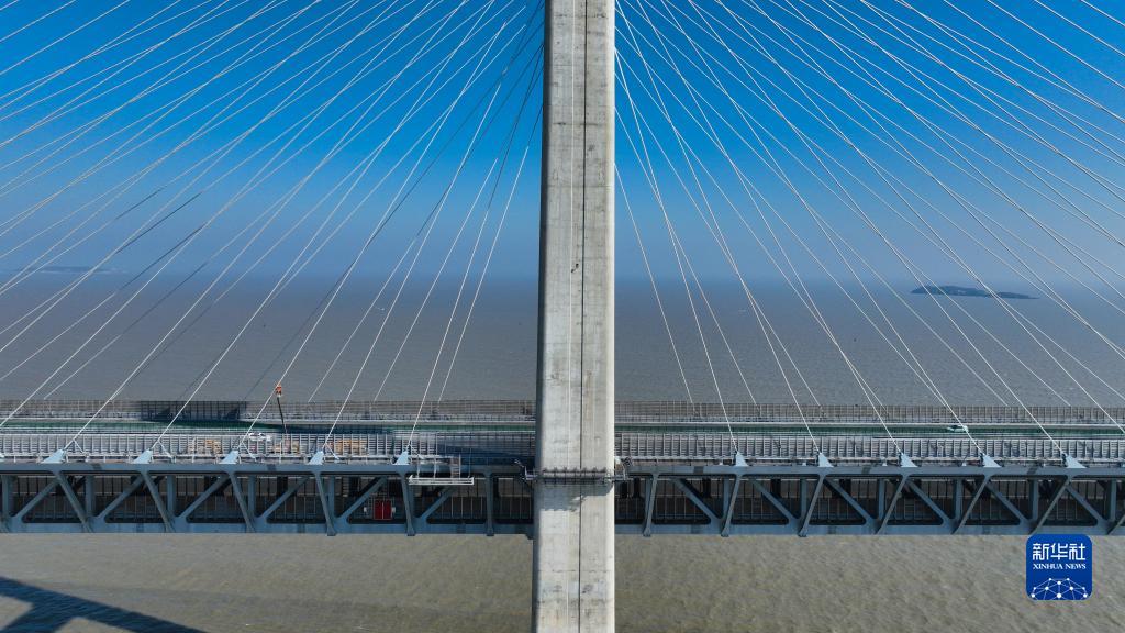 1月8日,在福建平潭公鐵兩用跨海大橋,福州工務(wù)段工作人員在高空對大橋斜拉索作業(yè)(無(wú)人機照片)。