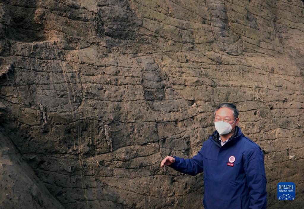 商丘市文物考古研究院院長(cháng)岳洪彬在河南商丘宋國故城遺址講解宋代城墻夯土發(fā)現的榫卯槽(1月6日攝)。