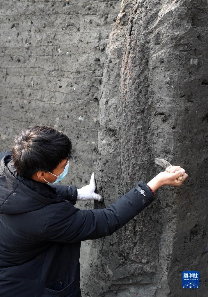 考古工作人員在河南商丘宋國故城遺址發(fā)掘現場(chǎng)清理永定柱四周夯土(1月6日攝)。
