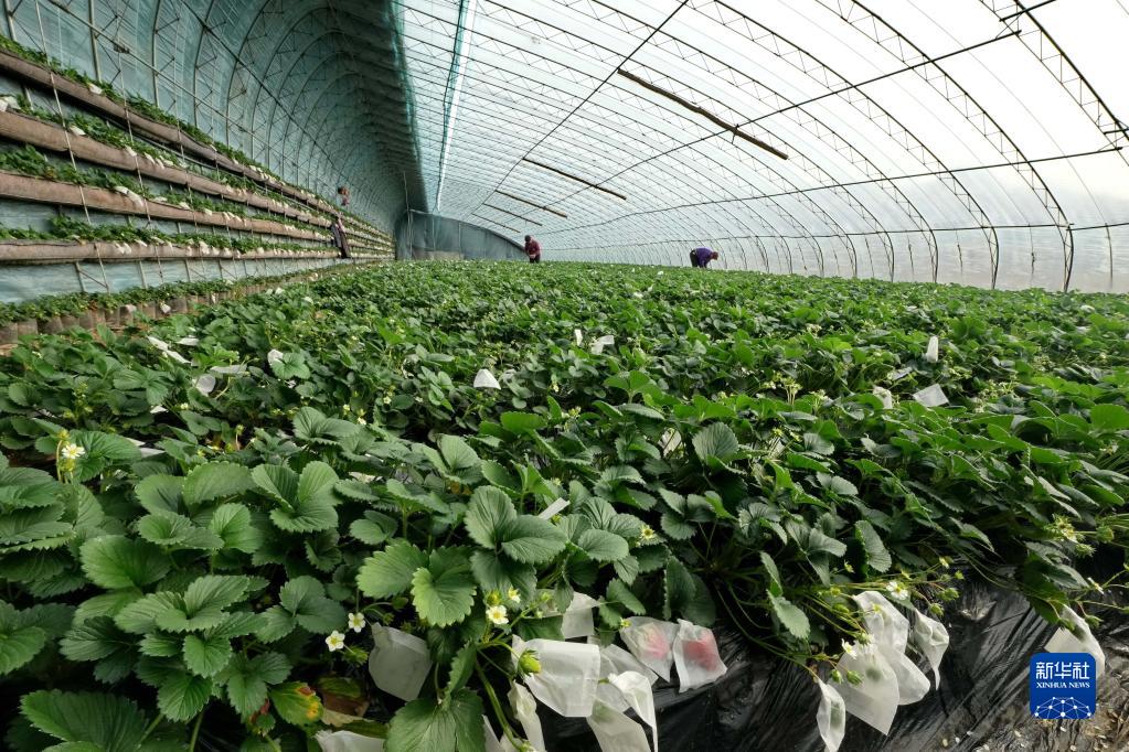 1月9日,盧龍縣劉田各莊鎮山善莊村一家庭農場(chǎng)的員工在大棚內管護草莓。