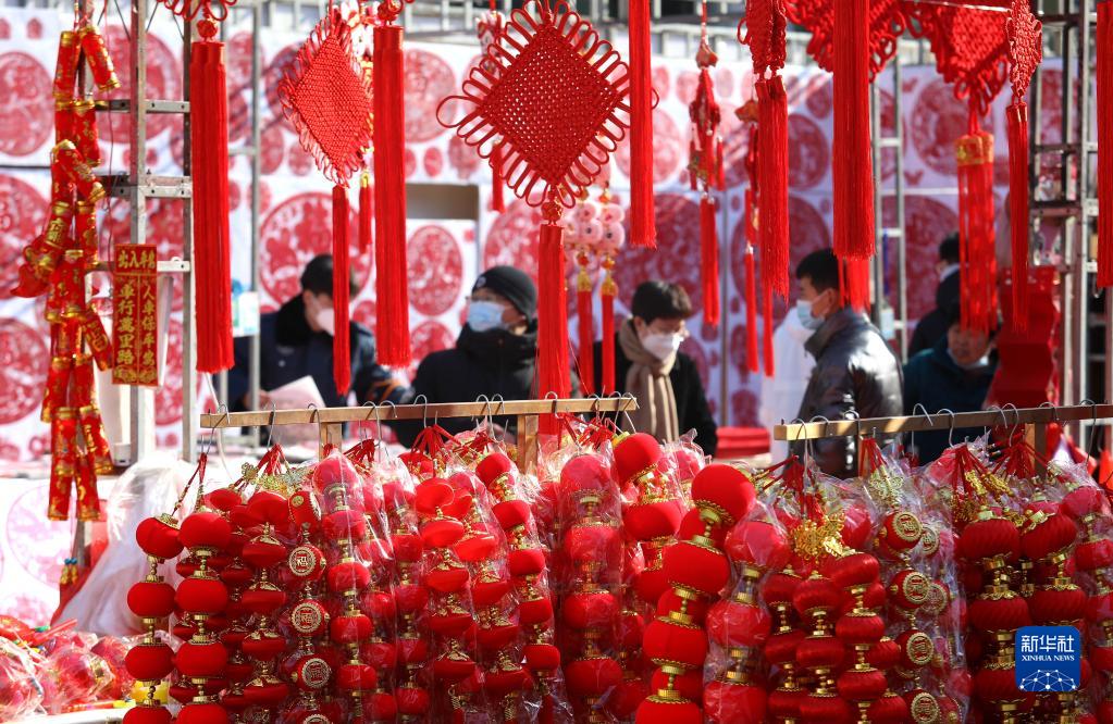 1月9日,市民在河北省石家莊市東大街年貨市場(chǎng)購買(mǎi)年貨飾品。