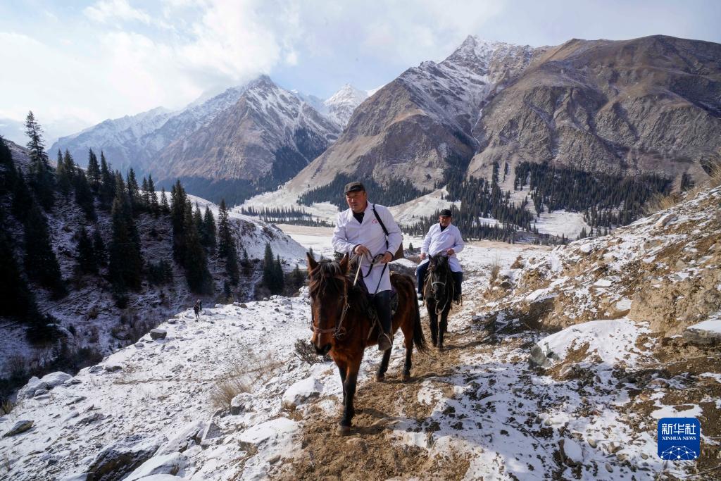 2022年1月25日,在新疆昭蘇縣的冬季牧場(chǎng)阿合牙孜溝,牧業(yè)醫院的醫生騎馬巡診。