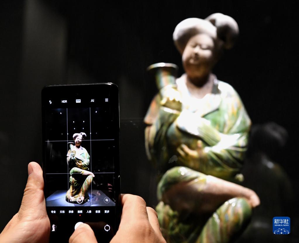 2022年8月30日,參觀(guān)者在河南鄭州大象陶瓷博物館內舉行的“唐三彩窯產(chǎn)品比較展”上拍攝唐三彩展品。這一展覽是我國五省十窯出土唐三彩器物的首次聯(lián)展。