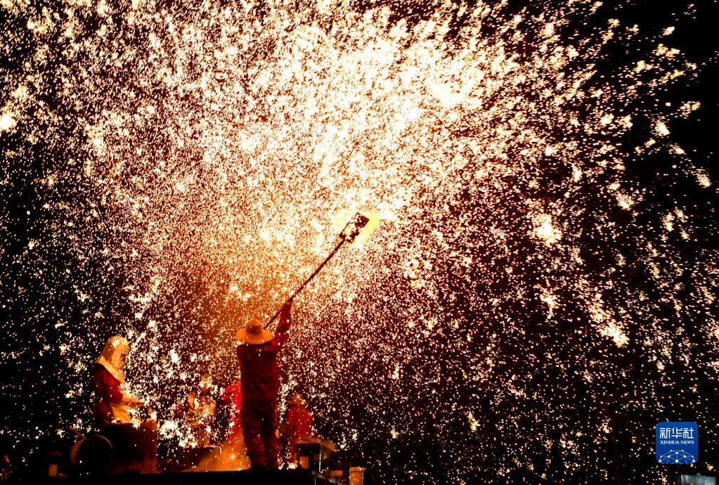 2022年2月14日,在河南省洛陽(yáng)市洛龍區隋唐城遺址植物園,民俗藝人為市民、游客表演“打鐵花”,喜迎元宵佳節。