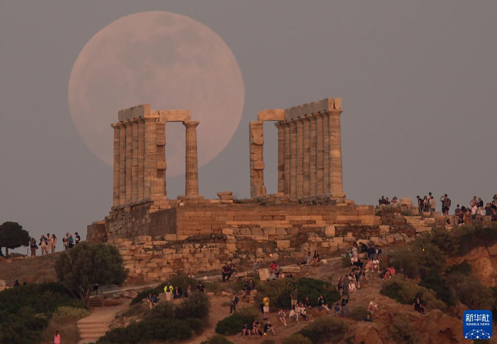 2022年5月15日晚,一輪滿(mǎn)月出現在希臘蘇尼翁的海神廟遺址上空。
