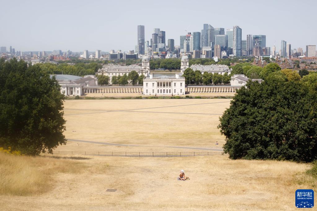 2022年7月18日,一名男子坐在英國倫敦格林尼治公園內枯黃的草地上。歐盟委員會(huì )聯(lián)合研究中心當日發(fā)布報告說(shuō),歐盟和英國總計近一半的領(lǐng)土正面臨干旱風(fēng)險。