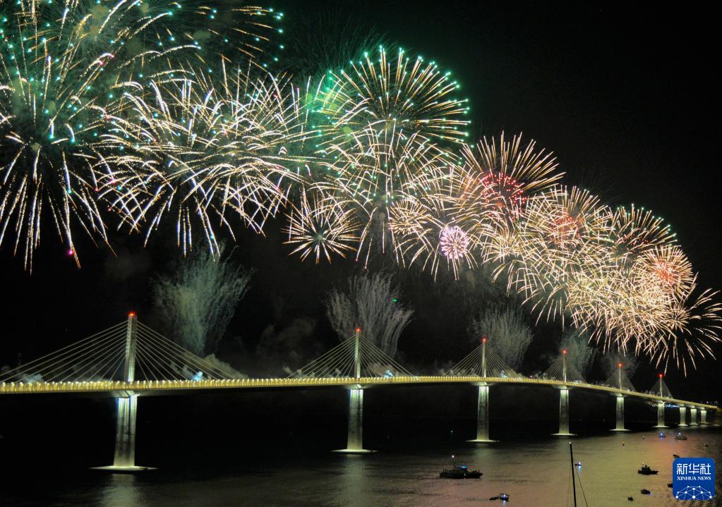2022年7月26日,克羅地亞科馬爾納燃放焰火慶祝中克共建“一帶一路”標志性項目佩列沙茨大橋通車(chē)。