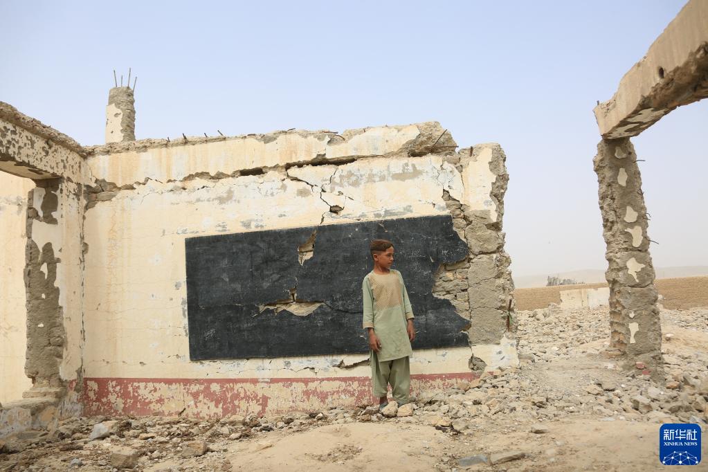 2022年8月23日,在阿富汗南部赫爾曼德省桑金地區,一名男孩站在美軍空襲造成的廢墟之中。距2021年8月30日美軍撤離阿富汗將滿(mǎn)一年之際,美軍在桑金地區造成的破壞仍歷歷在目。