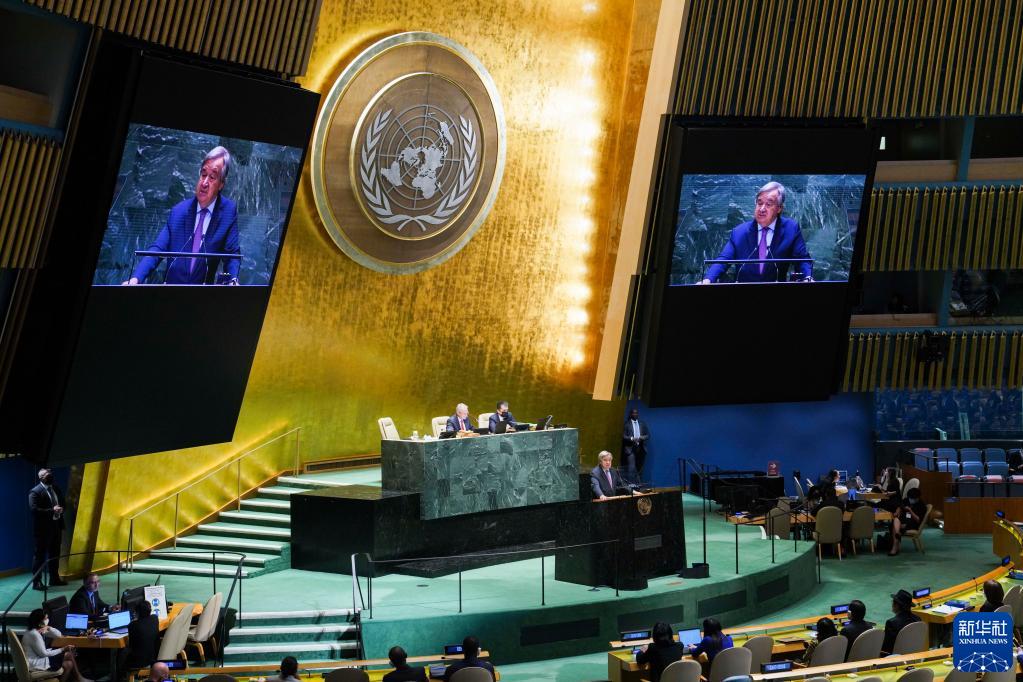 2022年9月13日,在位于紐約的聯(lián)合國總部,聯(lián)合國秘書(shū)長(cháng)古特雷斯在第77屆聯(lián)合國大會(huì )第一次全會(huì )上致辭。第77屆聯(lián)合國大會(huì )當天開(kāi)幕。這是新冠疫情暴發(fā)以來(lái),聯(lián)大首次舉行全面回歸線(xiàn)下的會(huì )議。