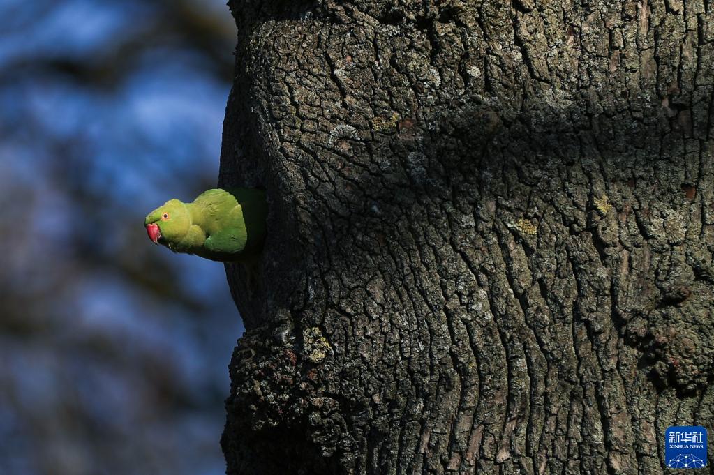 2022年3月7日,比利時(shí)布魯塞爾正值早春時(shí)節,一只鸚鵡從樹(shù)洞中探出頭。