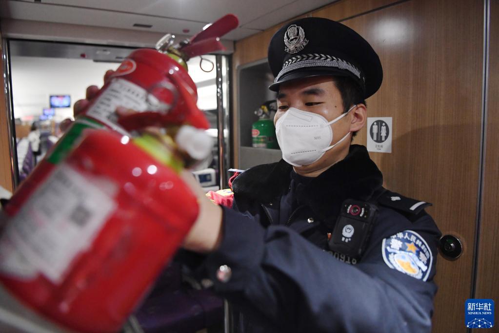1月9日,白旭偉在G2686次動(dòng)車(chē)組列車(chē)上檢查消防器材。