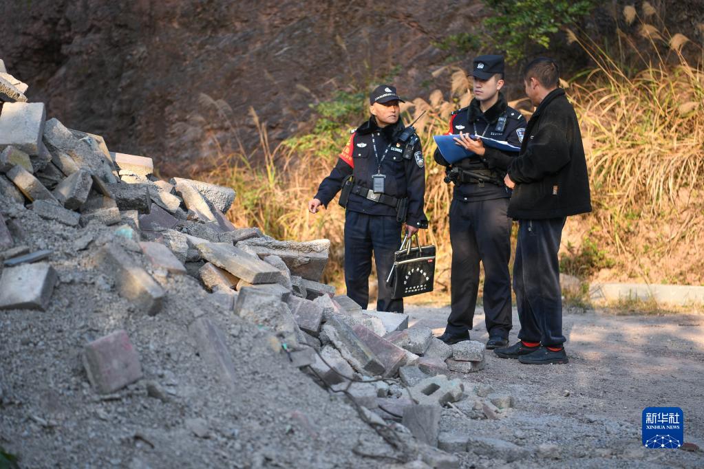 1月8日,鐵路警察王云(左)和謝源(中)對堆放建筑廢料影響鐵路橋墩穩定的村民進(jìn)行勸導。
