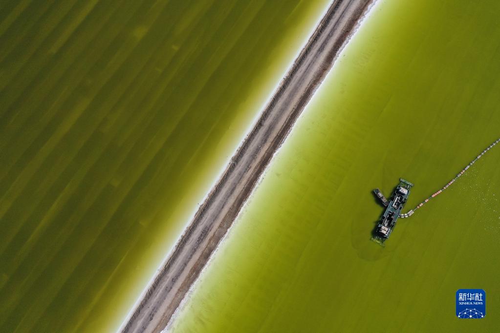 2022年4月1日,采鹽船在青海鹽湖工業(yè)股份有限公司鉀肥分公司的鹽湖工作(無(wú)人機照片)。每年3月至4月是春耕備耕關(guān)鍵期,青海鹽湖工業(yè)股份有限公司鉀肥分公司的各條生產(chǎn)線(xiàn)滿(mǎn)負荷生產(chǎn),助力春耕備耕。