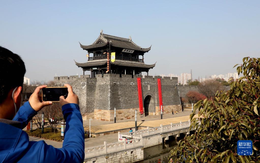 1月9日,一名市民在拍攝蘇州婁門(mén)古城門(mén)城墻上的巨幅春聯(lián)。新華社發(fā)(杭興微 攝)