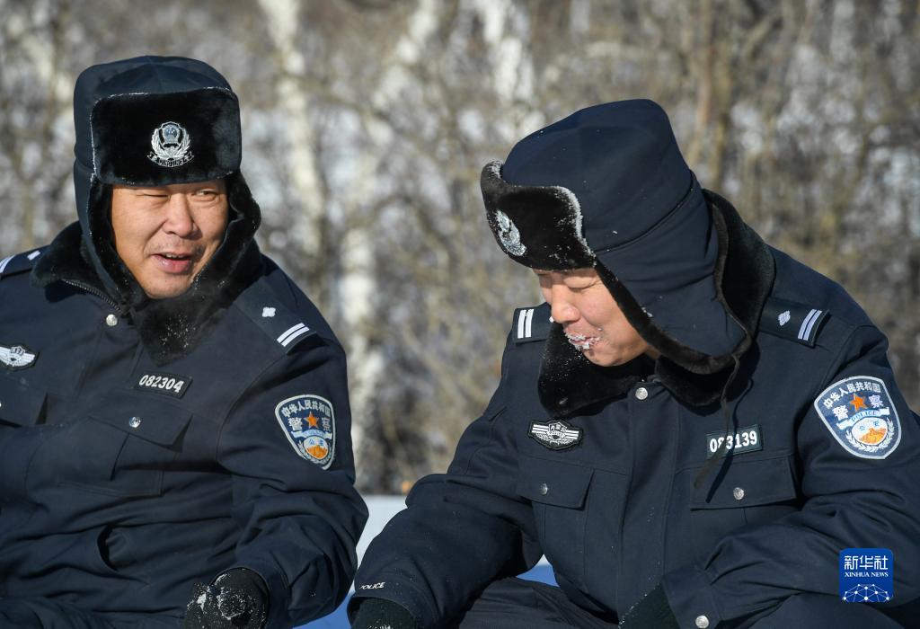 1月9日,西烏珠穆沁旗公安局古日格斯臺國家級自然保護區迪彥派出所民警呼德格琴(左)和王東濤(右)在巡邏途中吃雪解渴。