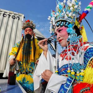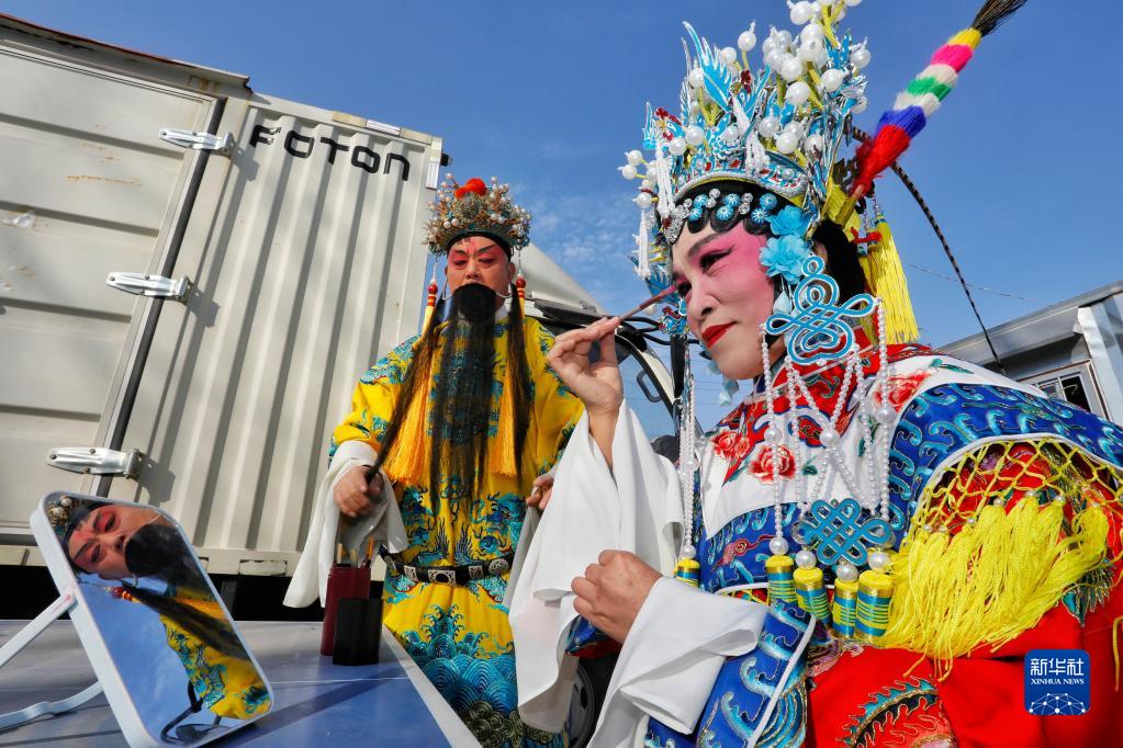 1月10號,在羊流鎮大洼村,戲曲演員準備表演豫劇曲目。