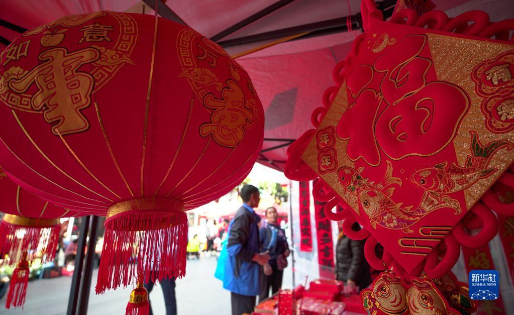 1月10日,人們在貴州省黔東南苗族侗族自治州丹寨縣年貨市場(chǎng)選購春節飾品。