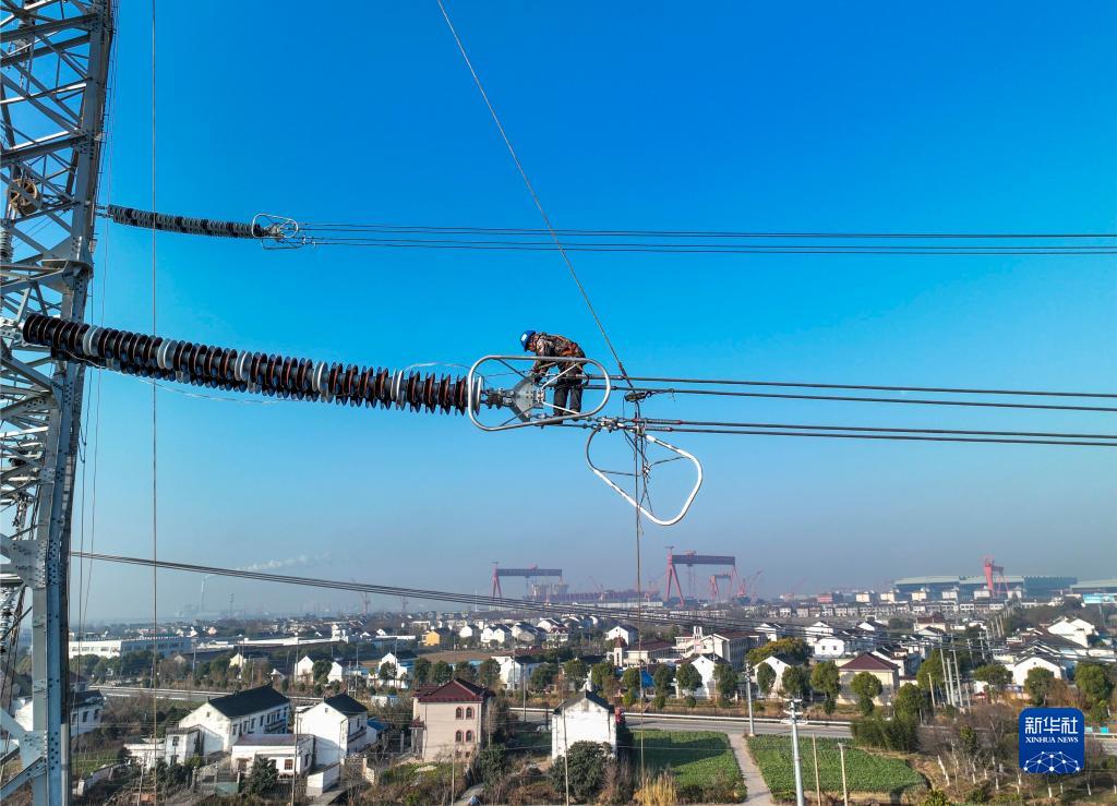 1月11日,在江蘇省靖江市新橋鎮,工人在進(jìn)行高空導線(xiàn)施放作業(yè)(無(wú)人機照片)。