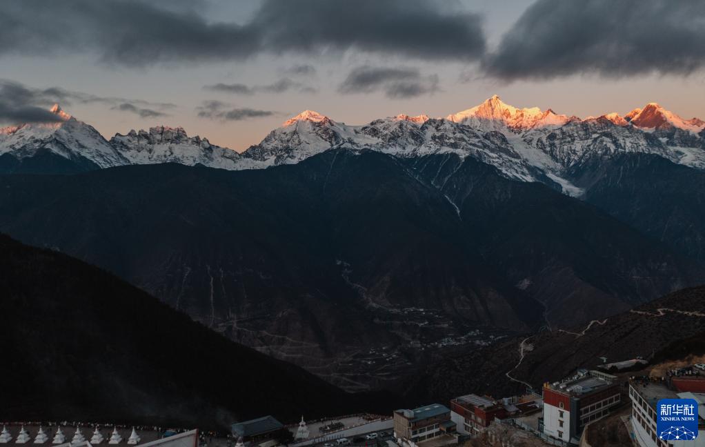 1月11日拍攝的梅里雪山“日照金山”美景(無(wú)人機照片)。