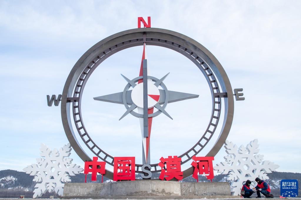 1月9日,在漠河市北極村的一處景區內,線(xiàn)路設備運維人員代洪濱(左)和馬國軍在檢查設備供電情況。新華社記者 張濤 攝