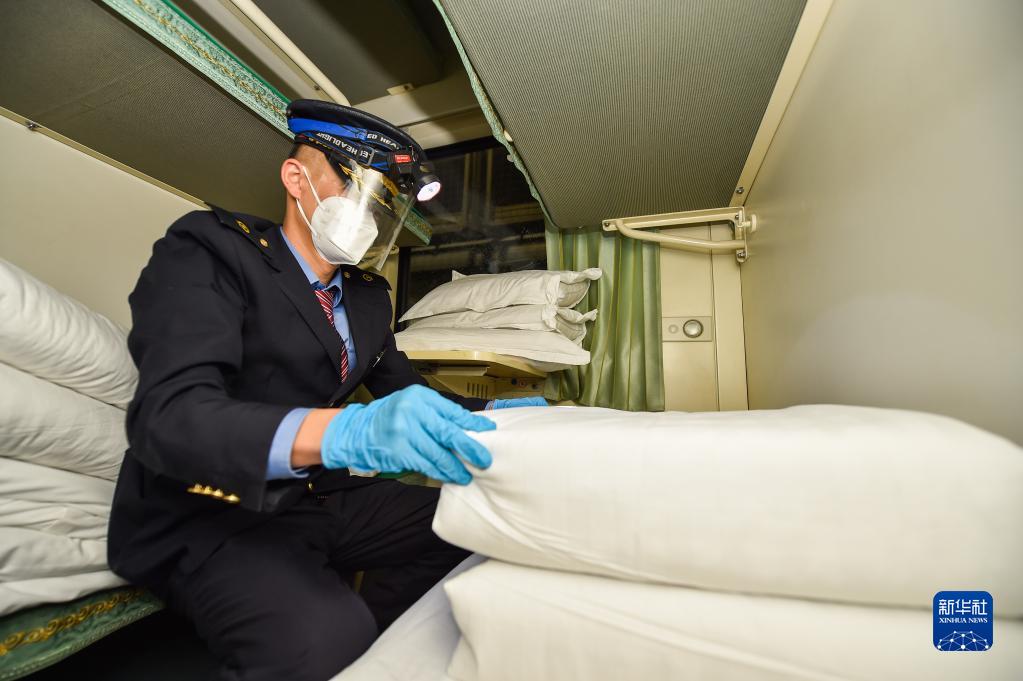 1月10日,在呼和浩特客運段整備旅服車(chē)間,列車(chē)員為列車(chē)換上干凈臥具。