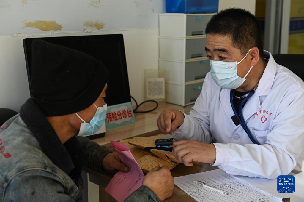 1月7日,在巴彥高勒衛生院,姚春明指導牧民使用指夾式血氧儀。