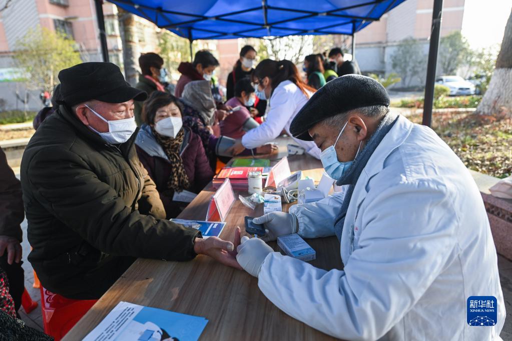 1月11日,在嘉興市南湖區余新鎮幸福社區,衛生院的醫生和志愿者為百姓義診并開(kāi)展健康防護微宣講。