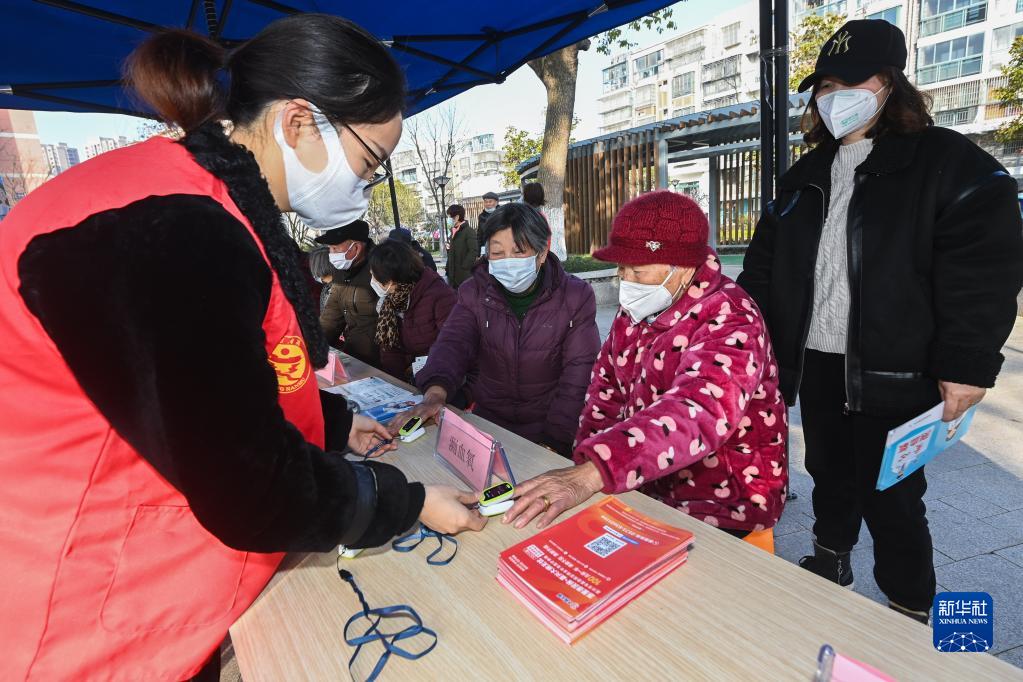 1月11日,在嘉興市南湖區余新鎮幸福社區,衛生院的醫生和志愿者為百姓測血氧并開(kāi)展健康防護微宣講。