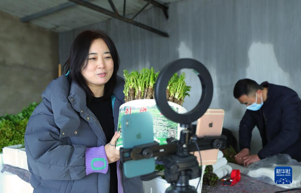 1月9日,在新民市大民屯鎮毓寶臺村大棚里,農民在大棚里直播銷(xiāo)售刺嫩芽盆栽。