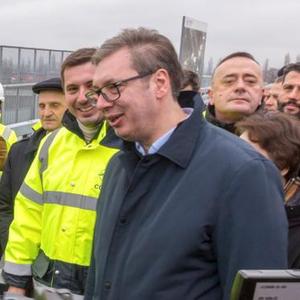 1月11日,塞爾維亞總統武契奇(右)在首都貝爾格萊德視察“新貝爾格萊德-蘇爾欽”高速公路項目施工現場(chǎng)時(shí)與塞中兩國建設者見(jiàn)面。