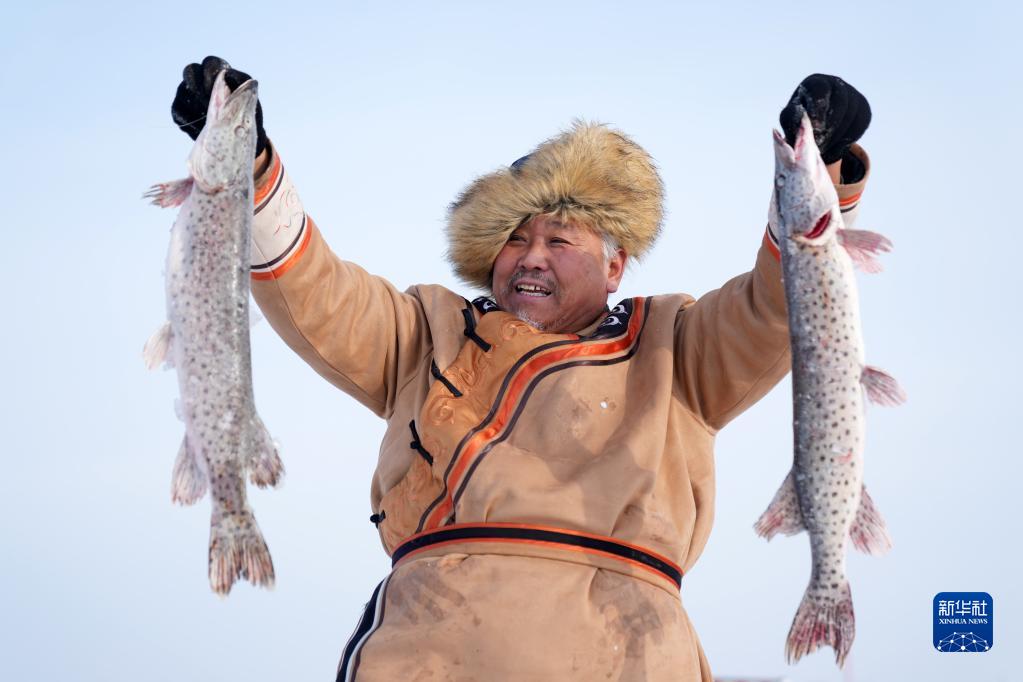 1月11日,在撫遠市東湖,赫哲族群眾展示剛捕上來(lái)的魚(yú)。