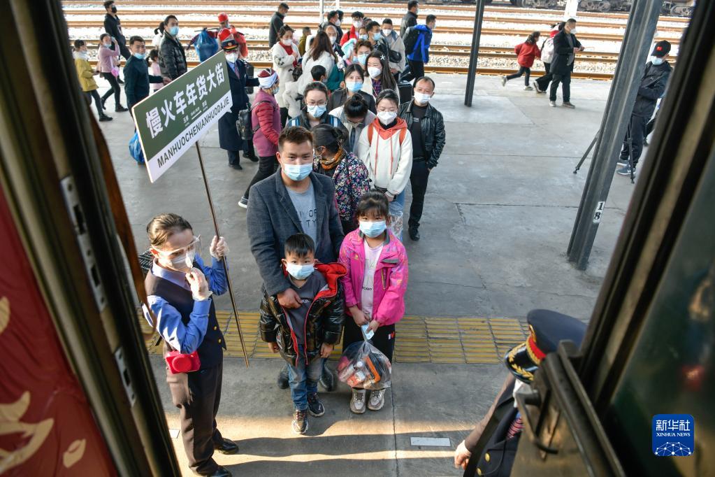 1月10日,旅客在貴州凱里站排隊準備登上5640次列車(chē)出行。
