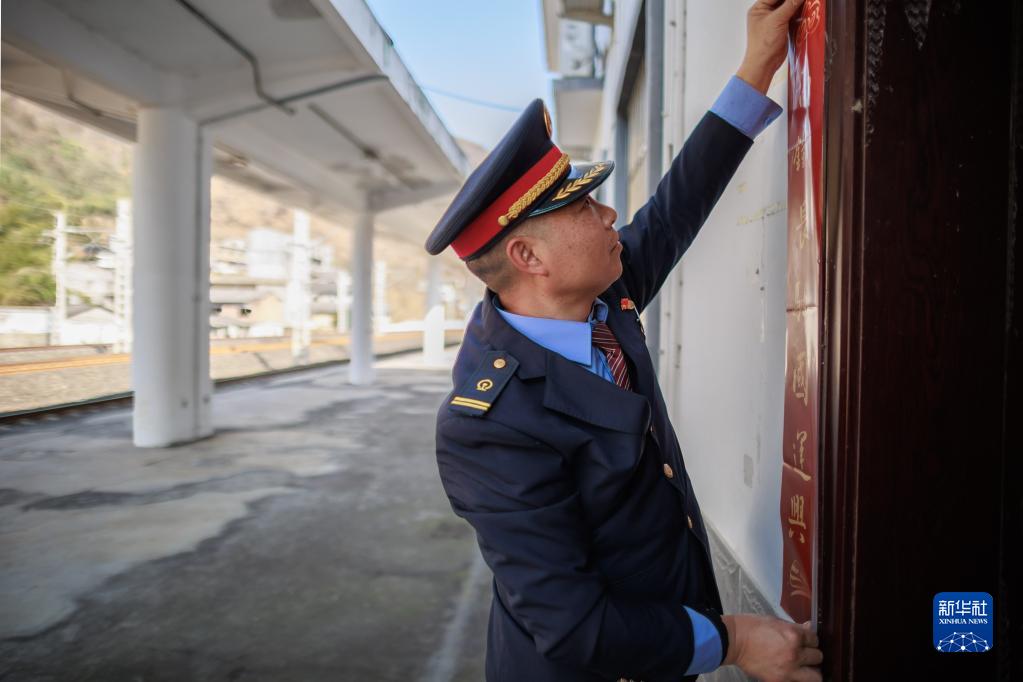 毛忠輝在值班室外墻上貼春聯(lián)(1月11日攝)。
