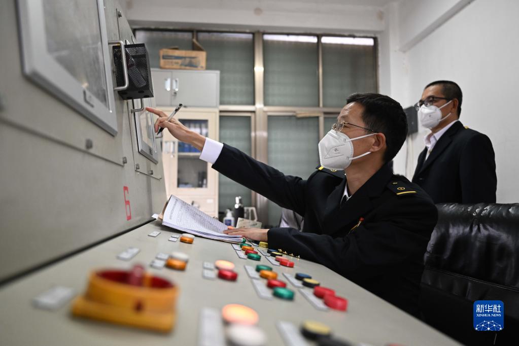 在廣東徐聞的粵海鐵路輪渡北港碼頭,熊美周在棧橋班組工作間操作設備(1月8日攝)。